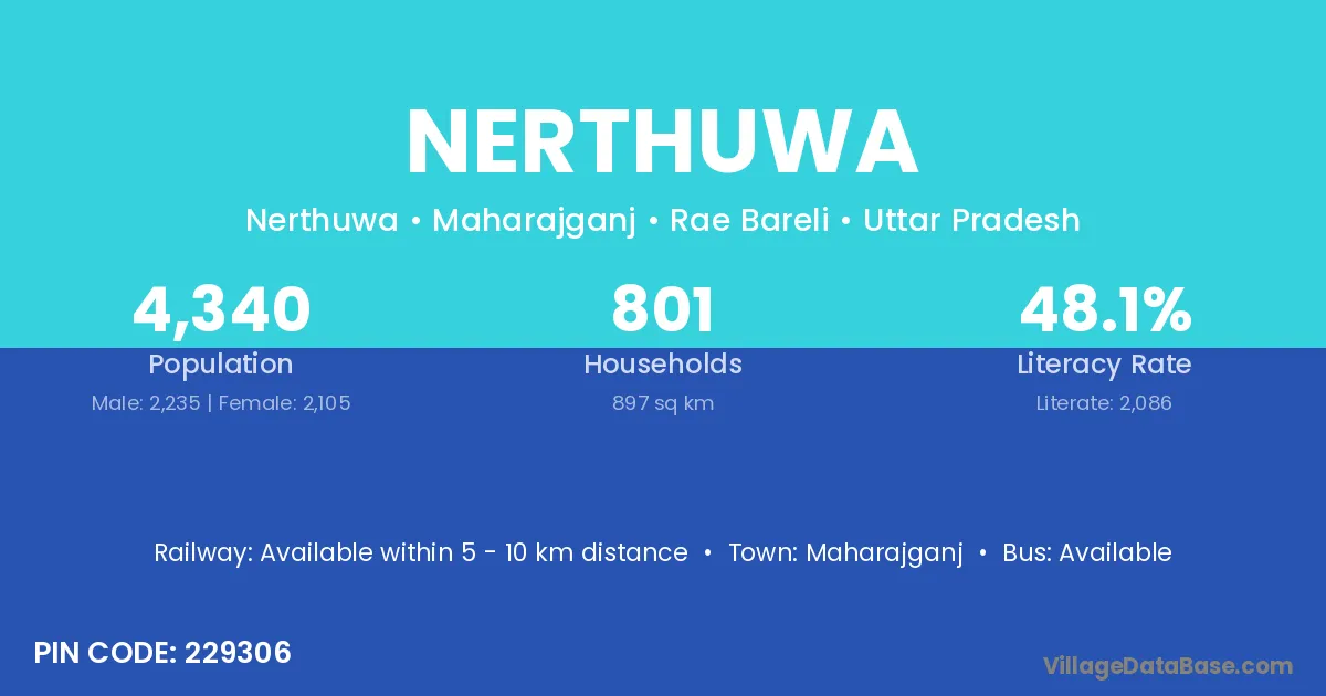 Nerthuwa village has a total population of 4,340 people, of which 2,235 are males and 2,105 are females.