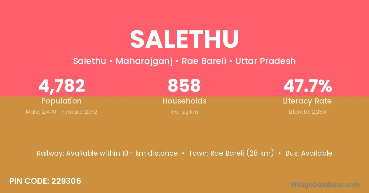 Rae Bareli (28 km) is the nearest town to Salethu village for major economic activities and is located approximately 28 km away.