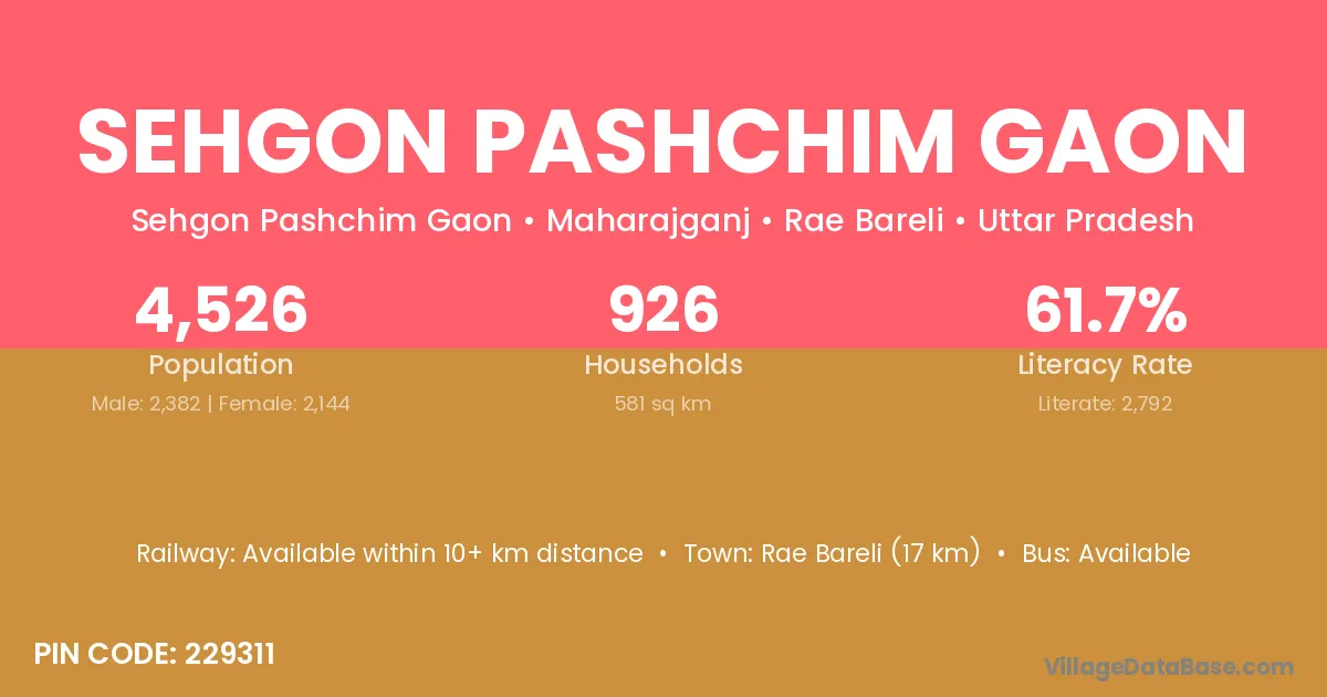 Rae Bareli (17 km) is the nearest town to Sehgon Pashchim Gaon village for major economic activities and is located approximately 17 km away.