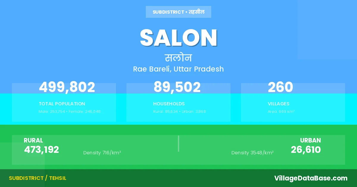 According to the 2011 census The total area of Salon Tehsil is 669 km², with a population of 499802 people. The population density is 748 inhabitants per square kilometre, and there are approximately 89502 houses in the sub district.