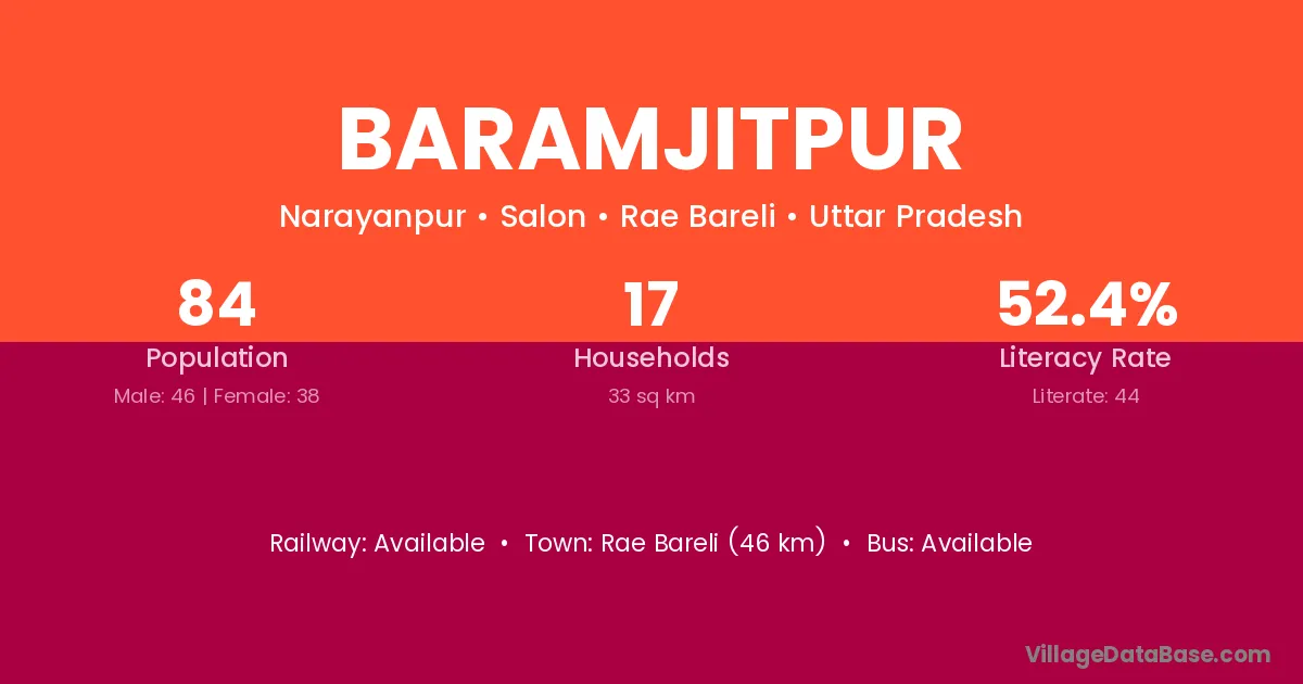 Baramjitpur village has a total population of 84 people, of which 46 are males and 38 are females.