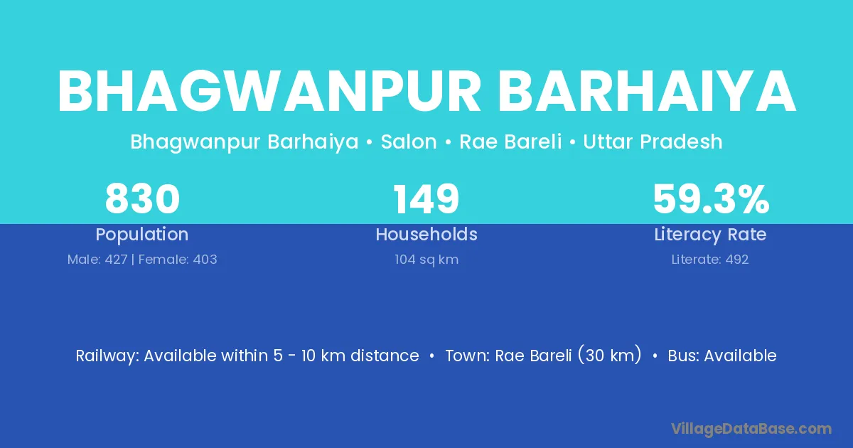 Rae Bareli (30 km) is the nearest town to Bhagwanpur Barhaiya village for major economic activities and is located approximately 30 km away.