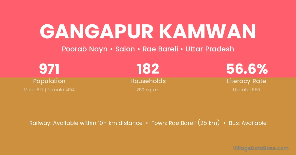 Rae Bareli (25 km) is the nearest town to Gangapur Kamwan village for major economic activities and is located approximately 25 km away.