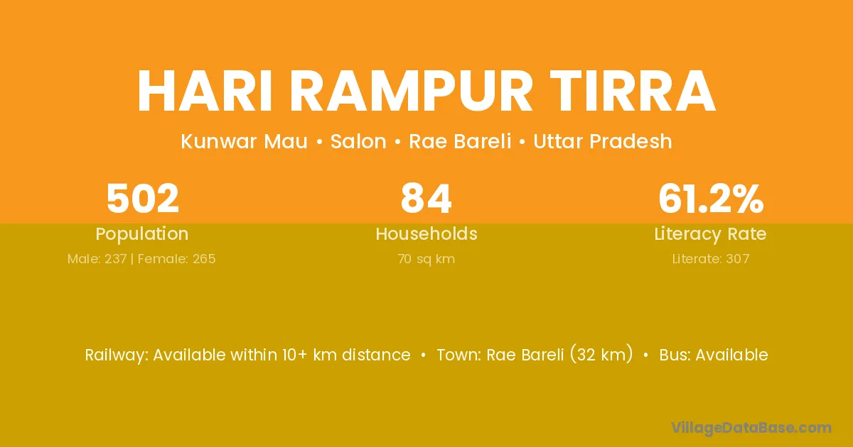 Rae Bareli (32 km) is the nearest town to Hari Rampur Tirra village for major economic activities and is located approximately 32 km away.