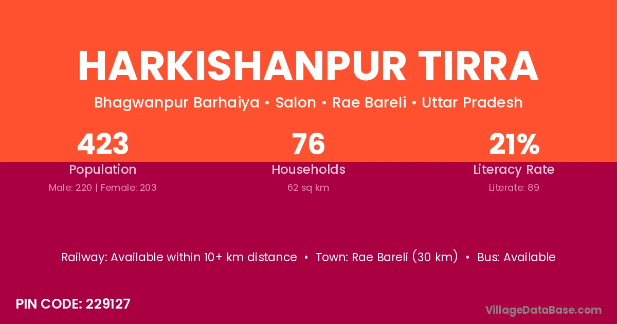 Rae Bareli (30 km) is the nearest town to Harkishanpur Tirra village for major economic activities and is located approximately 30 km away.
