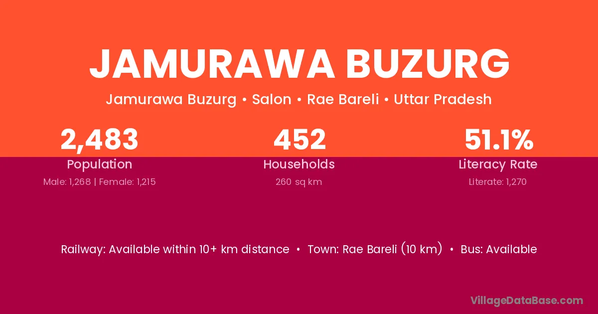 Rae Bareli (10 km) is the nearest town to Jamurawa Buzurg village for major economic activities and is located approximately 10 km away.