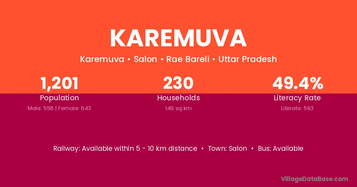 Karemuva village has a total population of 1,201 people, of which 558 are males and 643 are females.