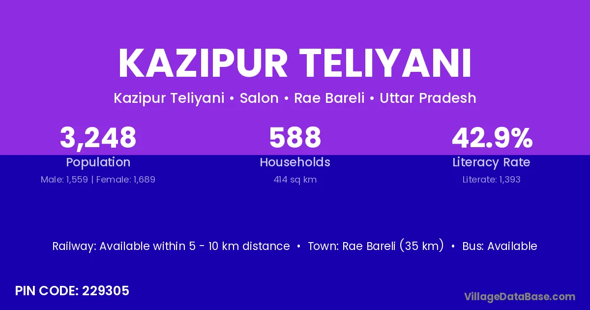 Rae Bareli (35 km) is the nearest town to Kazipur Teliyani village for major economic activities and is located approximately 35 km away.