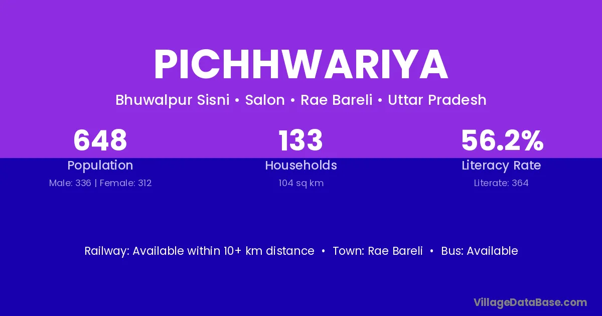 Pichhwariya village has a total population of 648 people, of which 336 are males and 312 are females.