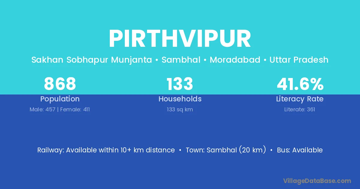 The literacy rate of Pirthvipur village is 50.31%. Male literacy stands at 59.08% and female literacy at 41.18%.