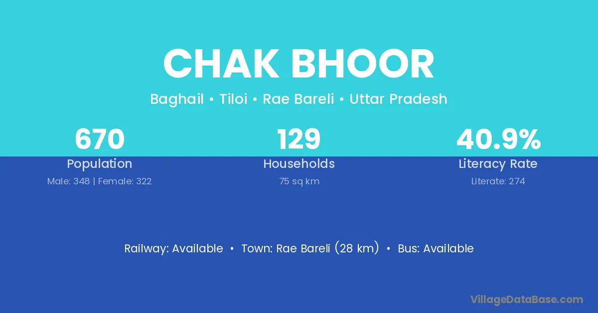 Rae Bareli (28 km) is the nearest town to Chak Bhoor village for major economic activities and is located approximately 28 km away.