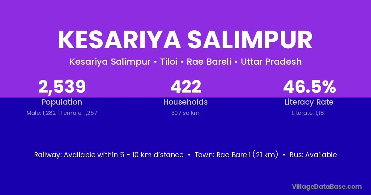 Rae Bareli (21 km) is the nearest town to Kesariya Salimpur village for major economic activities and is located approximately 21 km away.