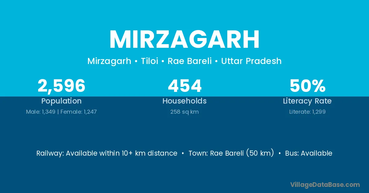 Rae Bareli (50 km) is the nearest town to Mirzagarh village for major economic activities and is located approximately 50 km away.