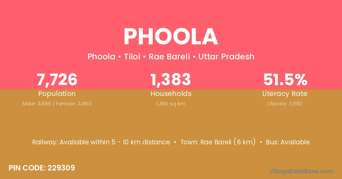 Rae Bareli (6 km) is the nearest town to Phoola village for major economic activities and is located approximately 6 km away.