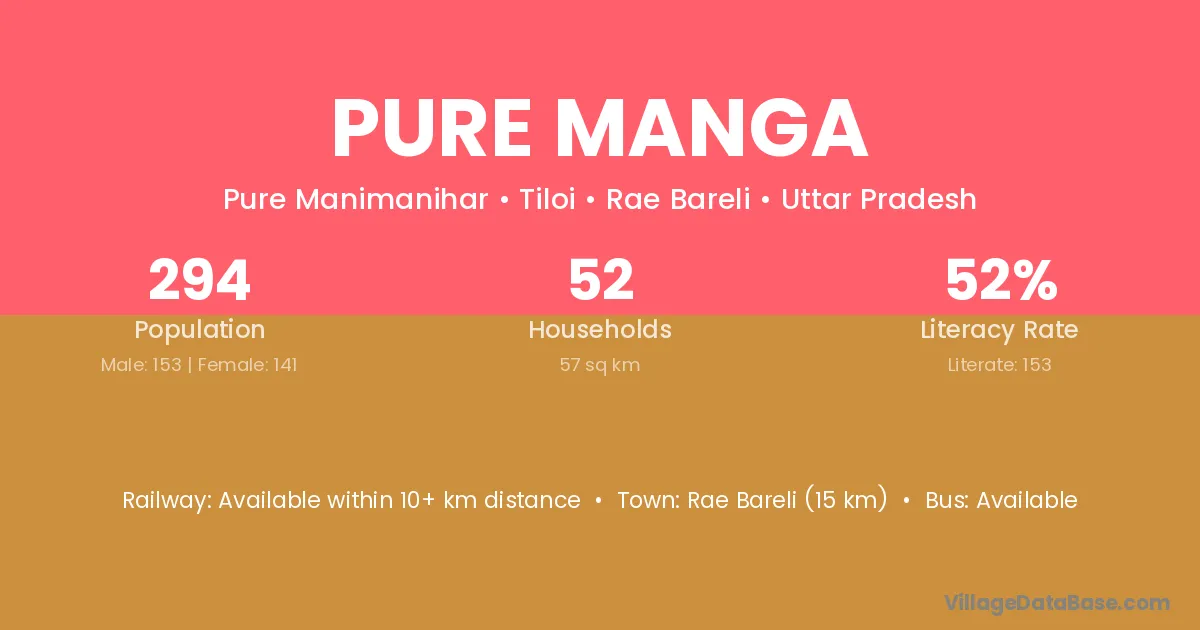 Rae Bareli (15 km) is the nearest town to Pure Manga village for major economic activities and is located approximately 15 km away.