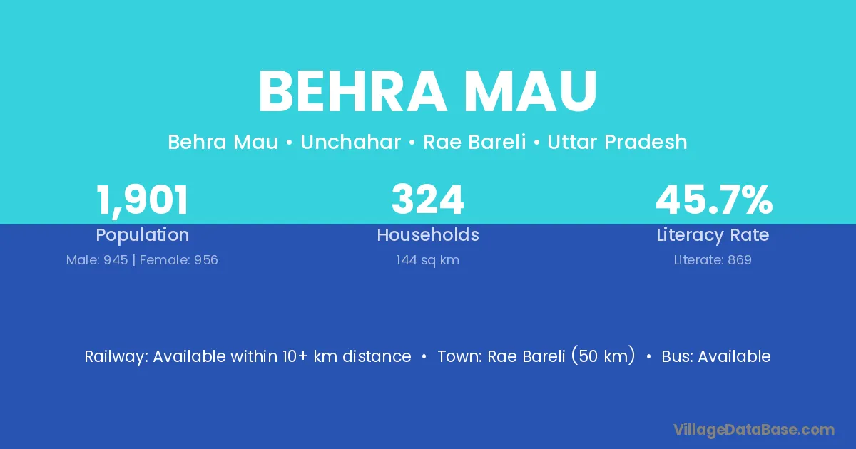 Rae Bareli (50 km) is the nearest town to Behra Mau village for major economic activities and is located approximately 50 km away.