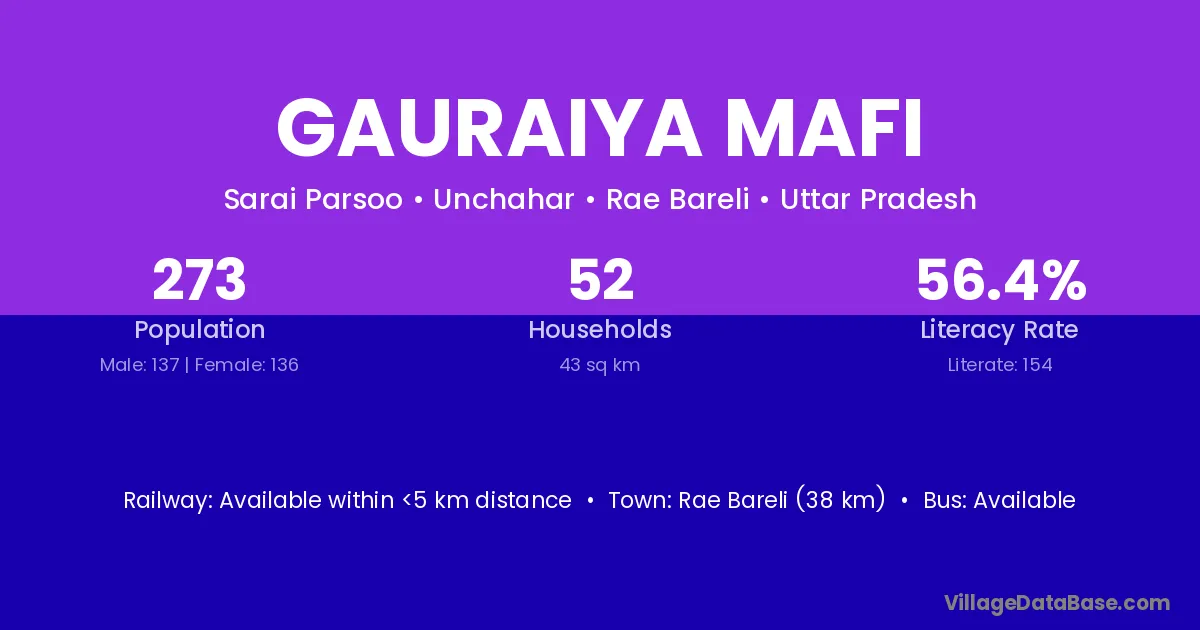 Gauraiya Mafi village has a total population of 273 people, of which 137 are males and 136 are females.
