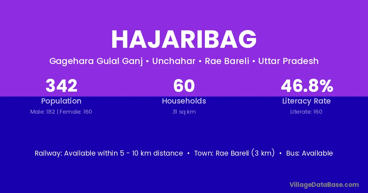 Rae Bareli (3 km) is the nearest town to Hajaribag village for major economic activities and is located approximately 3 km away.
