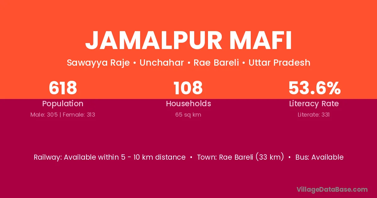 Rae Bareli (33 km) is the nearest town to Jamalpur Mafi village for major economic activities and is located approximately 33 km away.