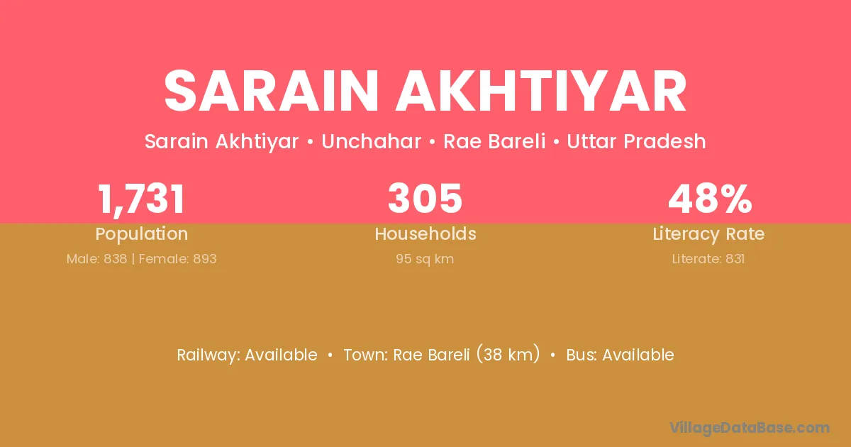 Rae Bareli (38 km) is the nearest town to Sarain Akhtiyar village for major economic activities and is located approximately 38 km away.