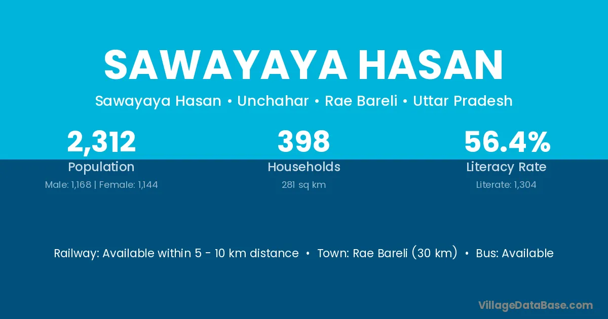 Rae Bareli (30 km) is the nearest town to Sawayaya Hasan village for major economic activities and is located approximately 30 km away.