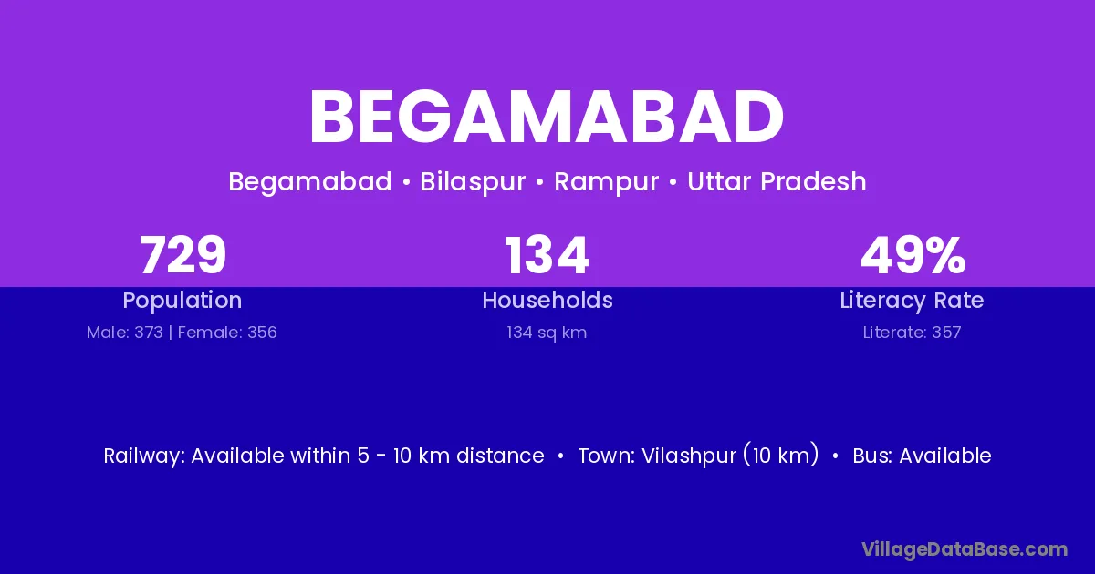Vilashpur (10 km) is the nearest town to Begamabad village for major economic activities and is located approximately 10 km away.