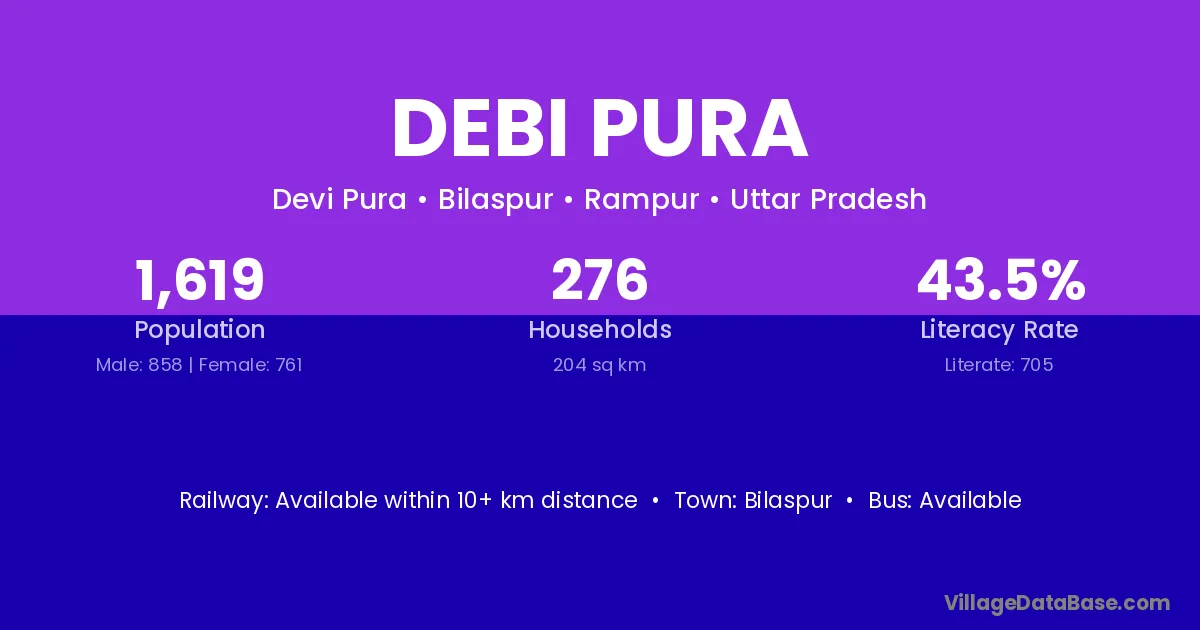The literacy rate of Debi Pura village is 43.55%. Male literacy stands at 51.98% and female literacy at 34.03%.