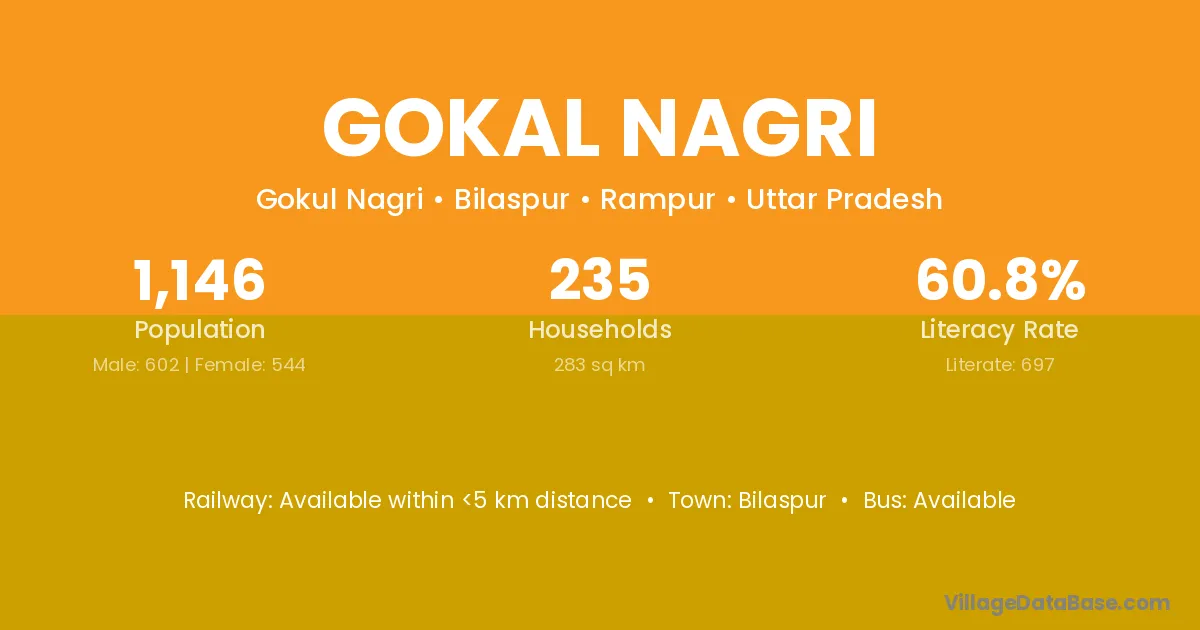 Gokal Nagri village has a total population of 1,146 people, of which 602 are males and 544 are females.