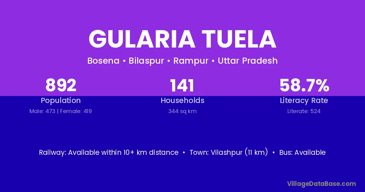 Vilashpur (11 km) is the nearest town to Gularia Tuela village for major economic activities and is located approximately 11 km away.