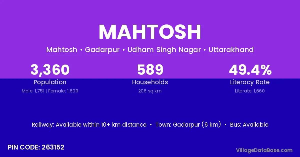 Vilashpur (15 km) is the nearest town to Mahtosh village for major economic activities and is located approximately 15 km away.
