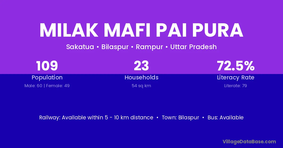 The literacy rate of Milak Mafi Pai Pura village is 72.48%. Male literacy stands at 73.33% and female literacy at 71.43%.