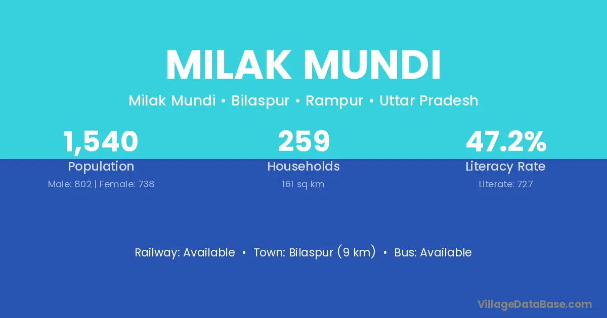 Bilaspur (9 km) is the nearest town to Milak Mundi village for major economic activities and is located approximately 9 km away.