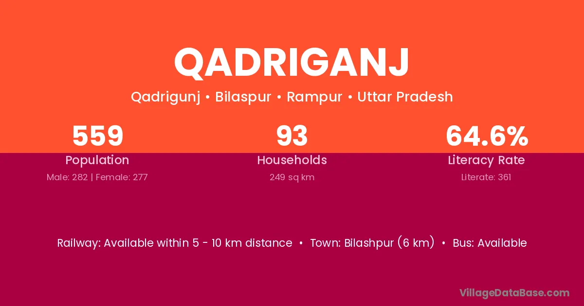 Qadriganj village has a total population of 559 people, of which 282 are males and 277 are females.