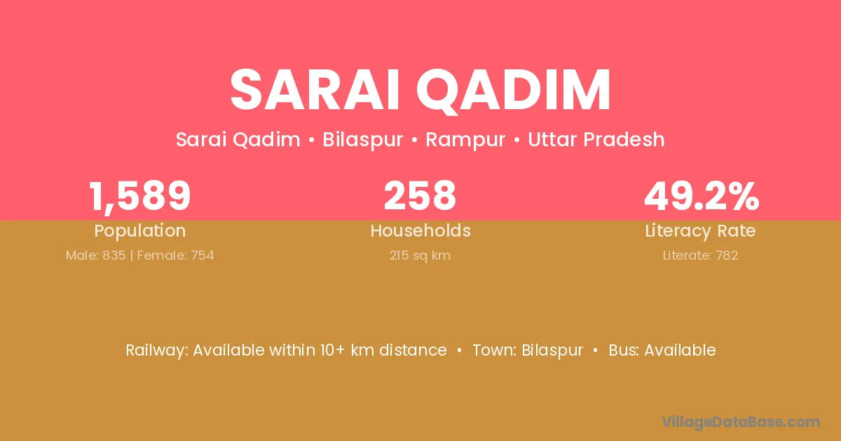 Sarai Qadim village has a total population of 1,589 people, of which 835 are males and 754 are females.