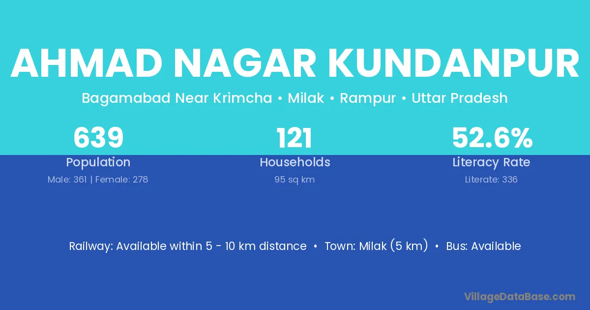 Milak (5 km) is the nearest town to Ahmad Nagar Kundanpur village for major economic activities and is located approximately 5 km away.