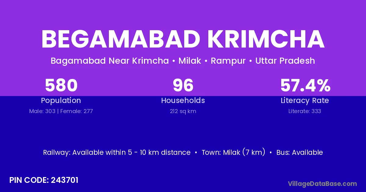 Begamabad Krimcha village has a total population of 580 people, of which 303 are males and 277 are females.