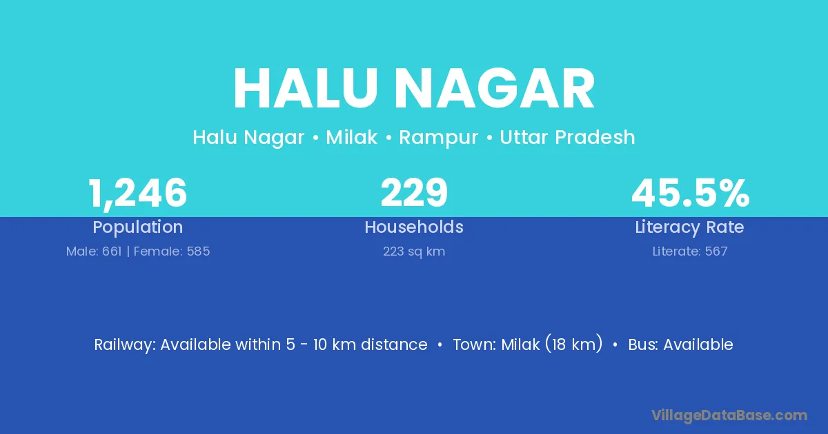 Milak (18 km) is the nearest town to Halu Nagar village for major economic activities and is located approximately 18 km away.
