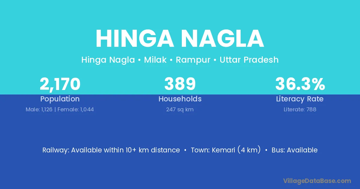 Kemari (4 km) is the nearest town to Hinga Nagla village for major economic activities and is located approximately 4 km away.