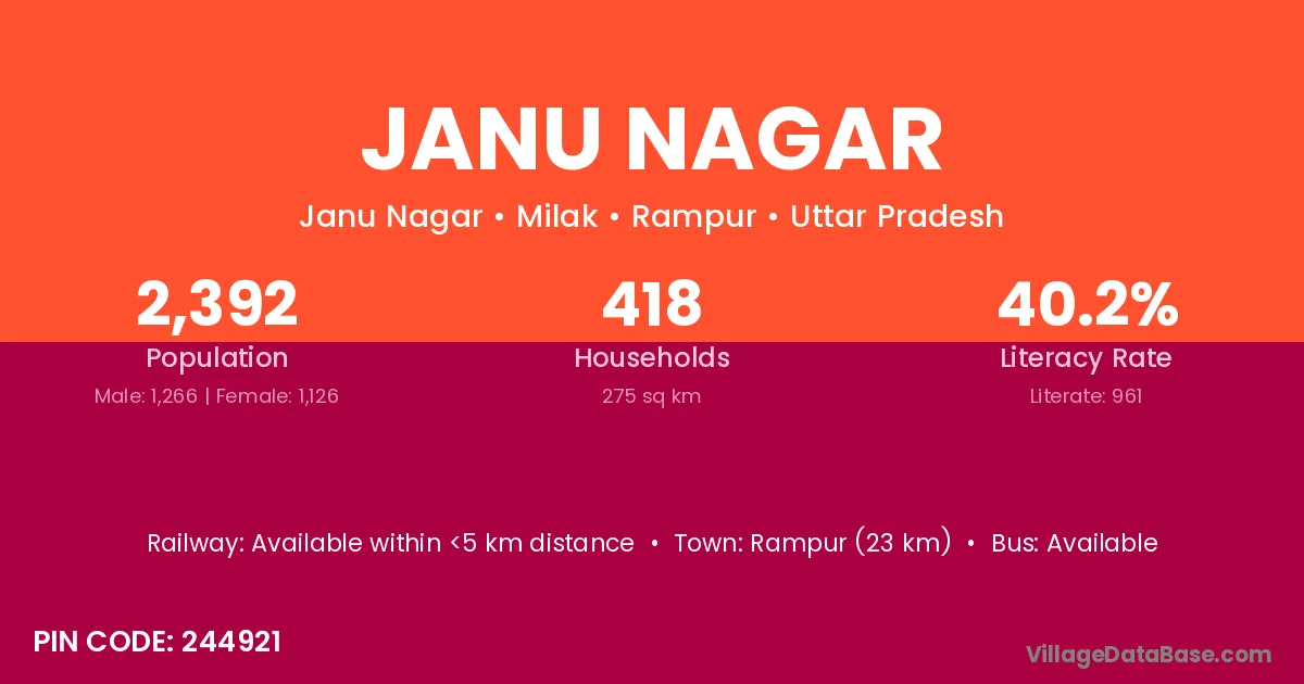 Rampur (23 km) is the nearest town to Janu Nagar village for major economic activities and is located approximately 23 km away.
