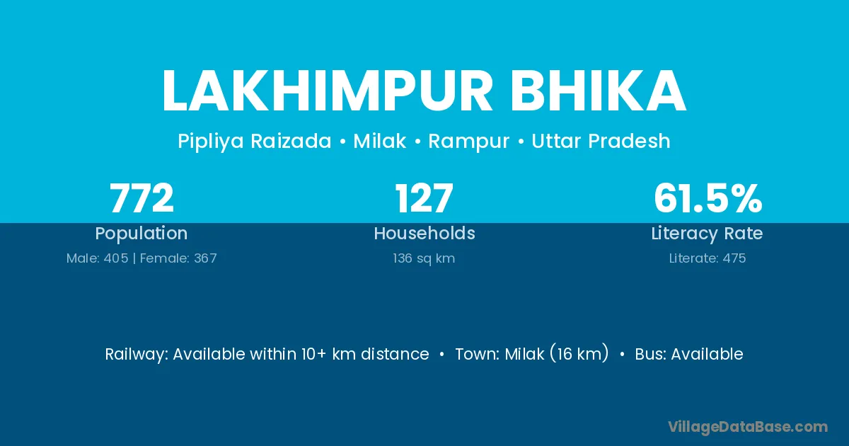 Milak (16 km) is the nearest town to Lakhimpur Bhika village for major economic activities and is located approximately 16 km away.