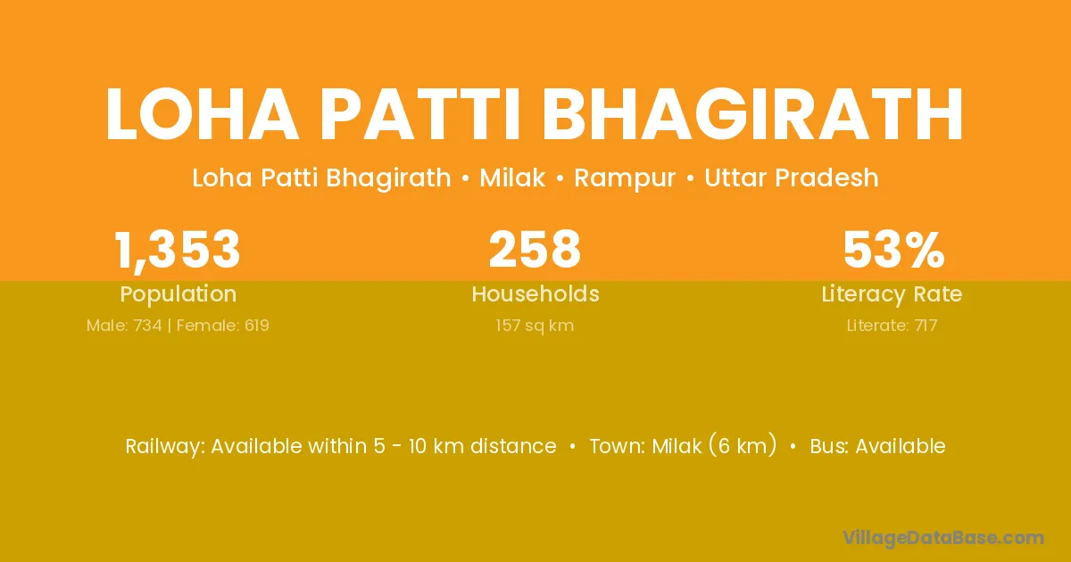 Milak (6 km) is the nearest town to Loha Patti Bhagirath village for major economic activities and is located approximately 6 km away.