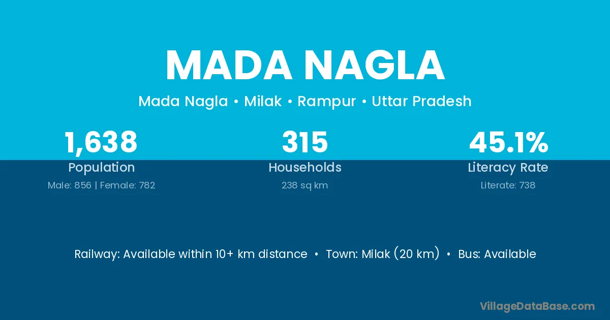 Milak (20 km) is the nearest town to Mada Nagla village for major economic activities and is located approximately 20 km away.