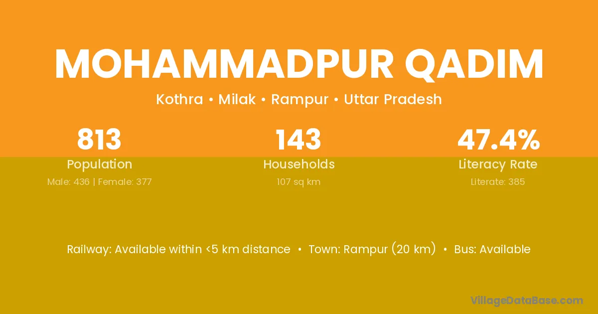 Rampur (20 km) is the nearest town to Mohammadpur Qadim village for major economic activities and is located approximately 20 km away.