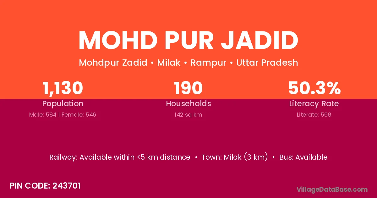 Mohd Pur Jadid village has a total population of 1,130 people, of which 584 are males and 546 are females.