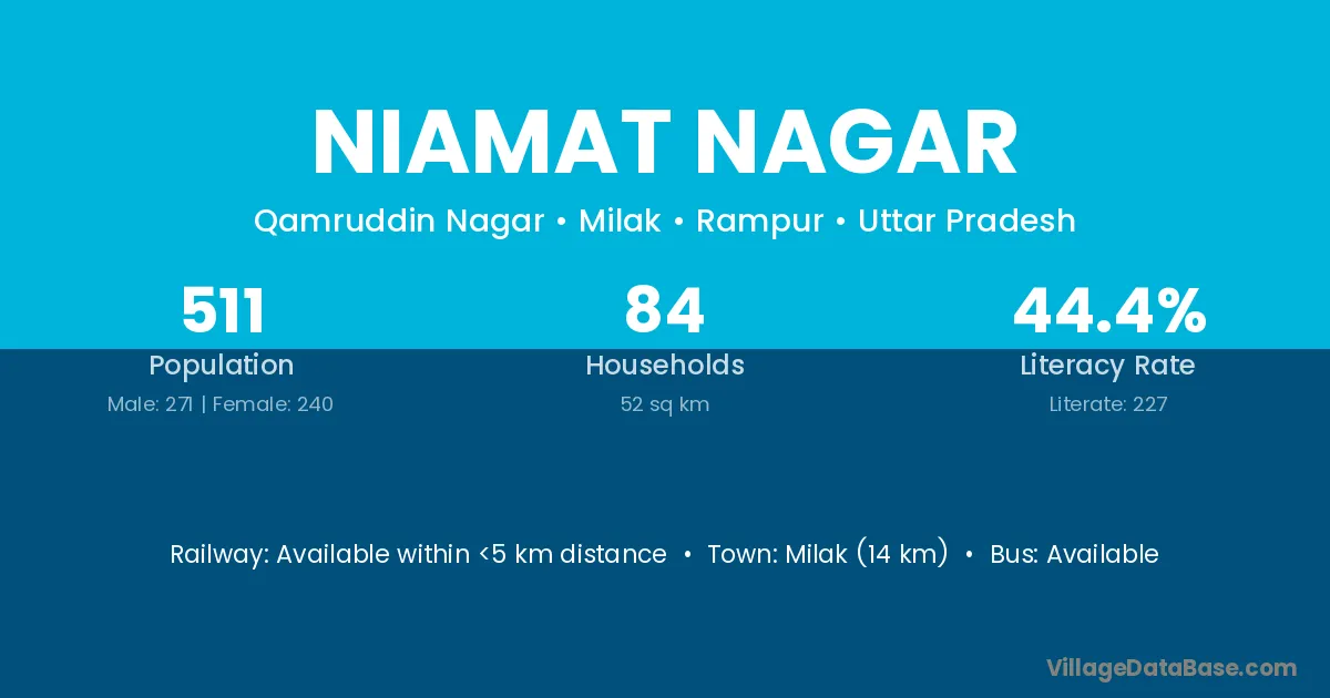 Milak (14 km) is the nearest town to Niamat Nagar village for major economic activities and is located approximately 14 km away.