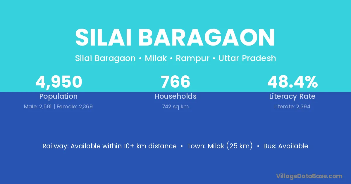 Silai Baragaon village has a total population of 4,950 people, of which 2,581 are males and 2,369 are females.