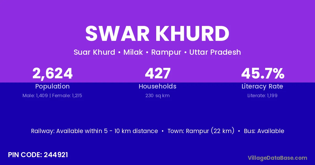 Swar Khurd village has a total population of 2,624 people, of which 1,409 are males and 1,215 are females.