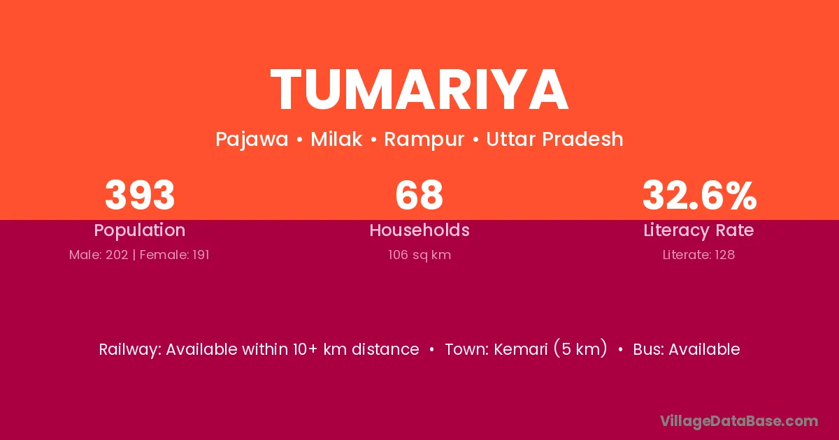 Tumariya village has a total population of 393 people, of which 202 are males and 191 are females.