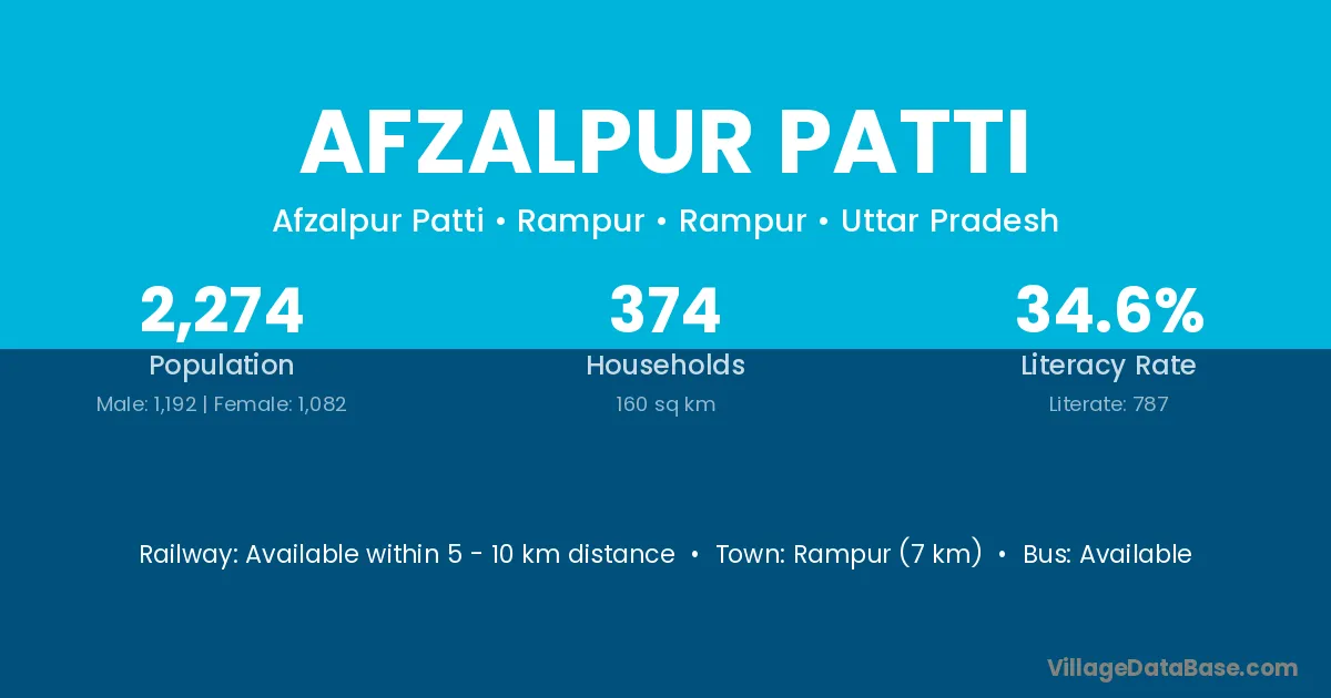 Rampur (7 km) is the nearest town to Afzalpur Patti village for major economic activities and is located approximately 7 km away.