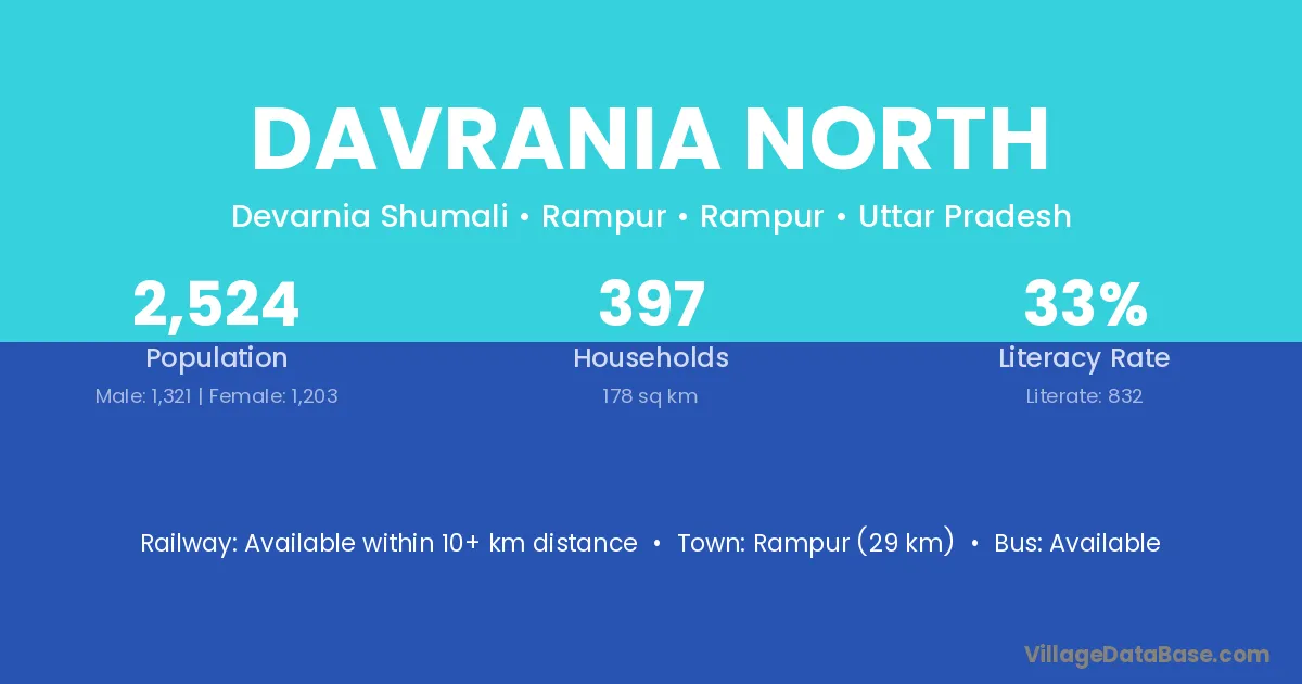 Rampur (29 km) is the nearest town to Davrania North village for major economic activities and is located approximately 29 km away.